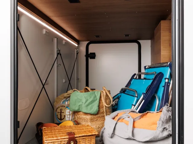- Dostatočný zadný úložný priestor (garáž) s 2 dverami a zámkami v automobilovom štýle